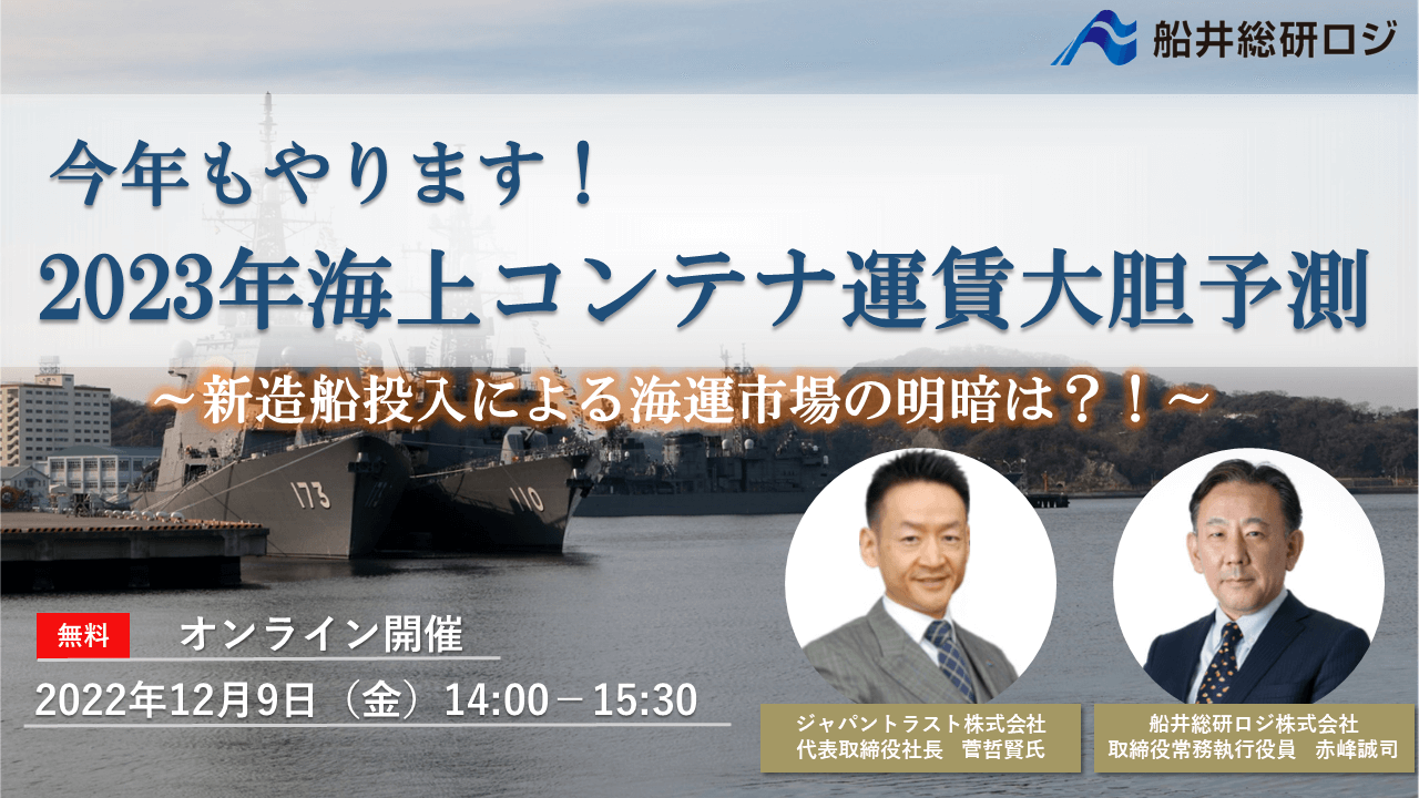 北米向け海上輸送のエキスパートである、ジャパントラスト株式会社 菅氏をお招きしたパネルディスカッション形式の講座です。北米航路における海上運賃市況から2023年の海上運賃予測について、弊社赤峰誠司とともに解説します。また、グローバル物流の動向を徹底予測!調達、販売において注力すべき事項について説明します。